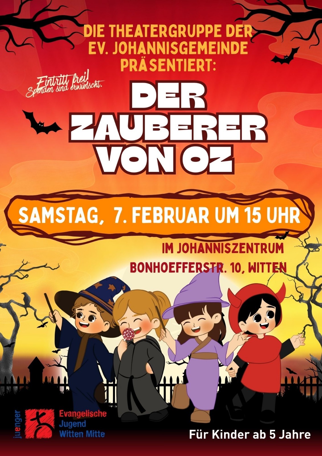 Der Zauberer von OZ Jan. 29, 2026 📅 Event-Details 🗓️ Datum: 07.02.2026 🕐 Uhrzeit: 15:00 Uhr 🏁 Enddatum: 07.02.2026 ⏰ Endzeit: 18:00 Uhr 📍 Veranstaltungsort: Ev.-Luth. Johannis-Kirchengemeinde, Bonhoefferstr. 10, 58452 Witten 🗺️ Standort & Kalender Karte wird geladen... 📍 Adresse: Bonhoefferstr. 10, 58452 Witten 🗺️ In OpenStreetMap öffnen 🧭 Route planen (Google Maps) 📆 Zu Kalender hinzufügen: 📥 iCal/Outlook 📅 Google Calendar