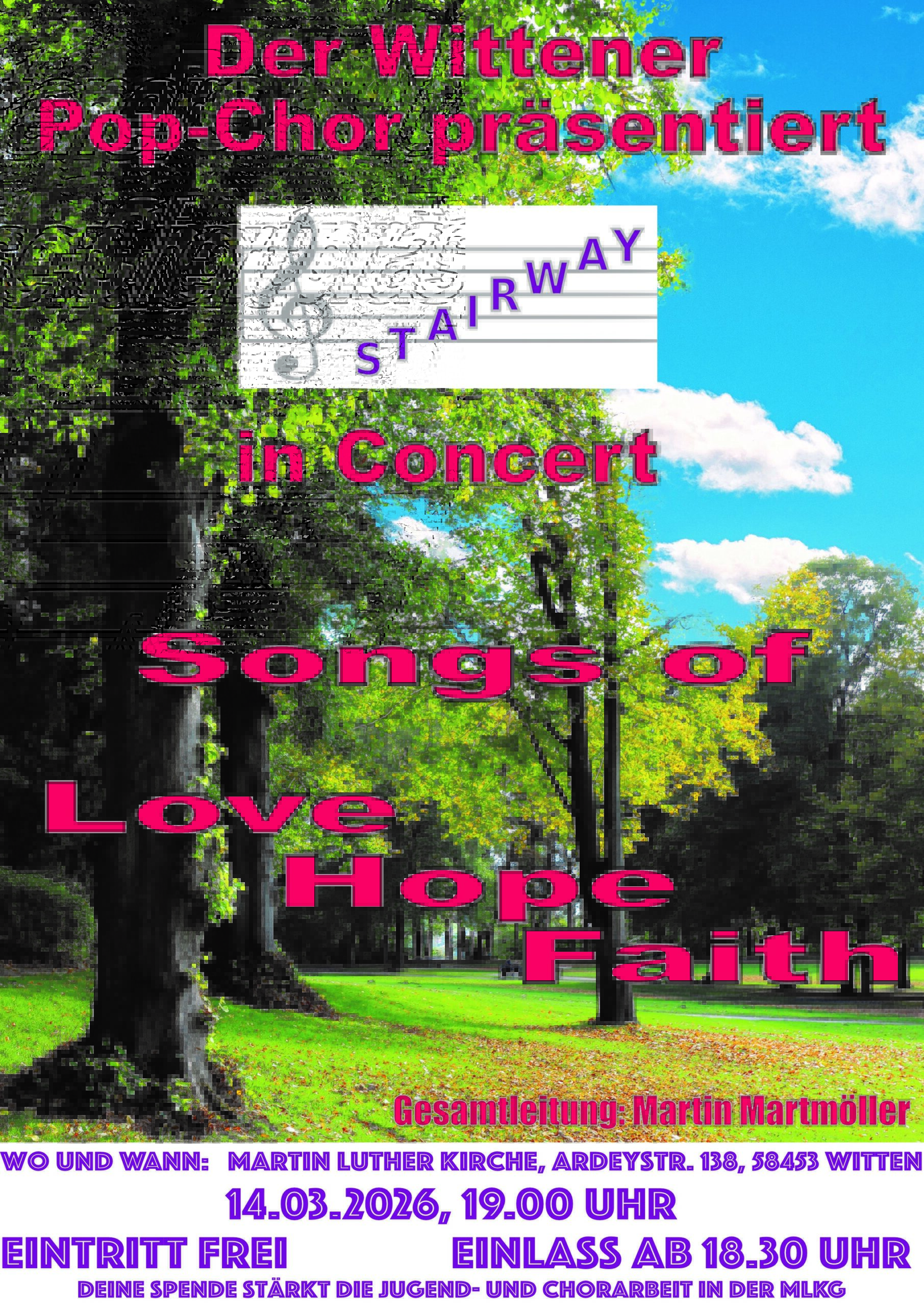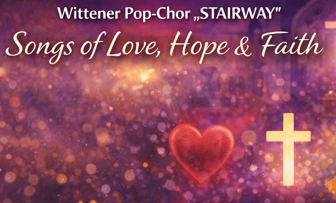 Der Wittener Pop-Chor „Stairway“ ist zu Gast in der Martin-Luther-Kirche Witten und lädt zu einem besonderen Konzertabend ein. Unter dem Titel „Songs of Love, Hope & Faith“ präsentiert der Chor ein abwechslungsreiches Programm mit modernen Pop- und Chorsongs, die von Liebe, Hoffnung und Glauben erzählen.