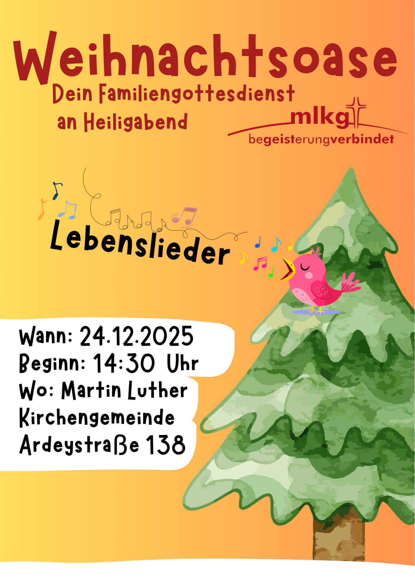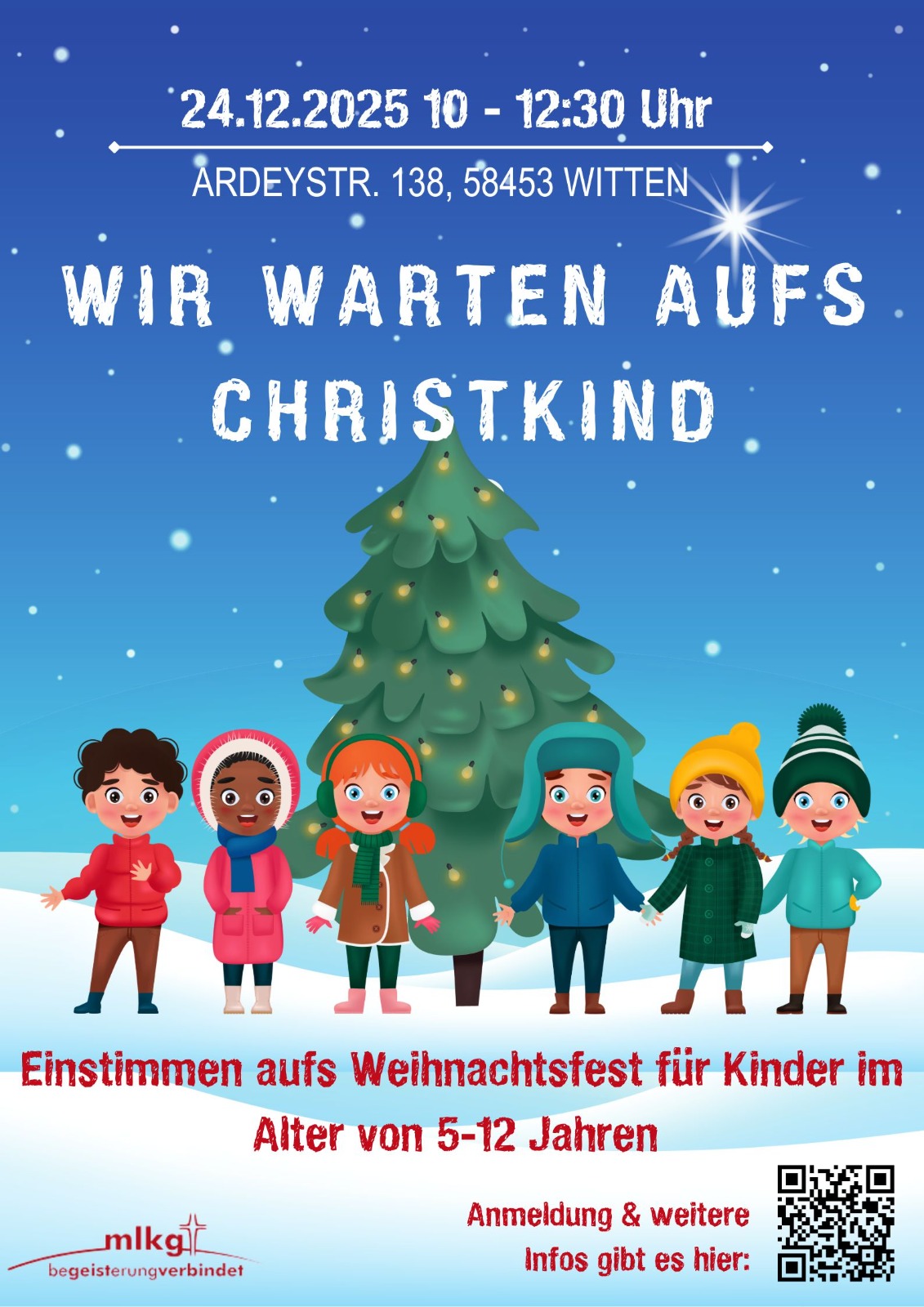 Damit die Eltern in Ruhe zu Hause alles vorbereiten können und den Kindern die Zeit bis zur Bescherung nicht zu lang wird, laden wir herzlich zu einem bunten Programm ins Martin-Luther-Zentrum ein. Gemeinsam mit unserer Gemeindediakonin Ann-Sophie Vollmer und ihrem Team wollen wir uns fröhlich und kreativ auf das Weihnachtsfest einstimmen.